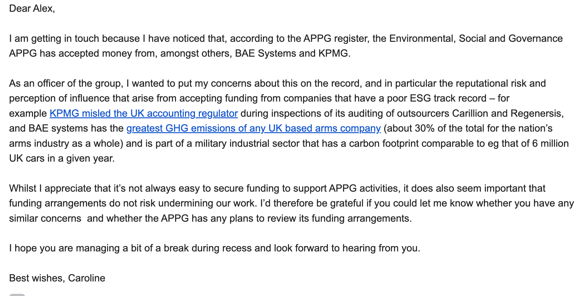 Caroline Lucas MP’s email to Alexander Stafford resigning from the ESG APPG
